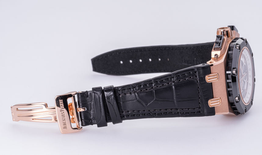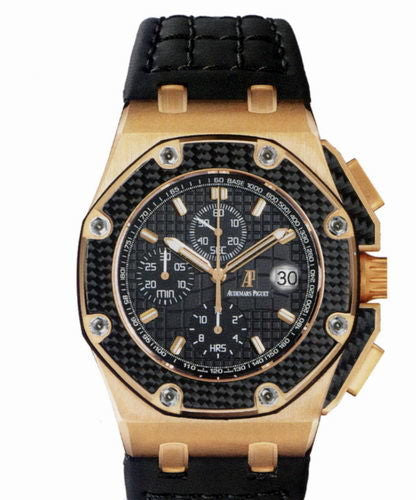 Preowned - 26030RO.OO.D001IN.01 Audemars Piguet. This is a men's watch with a 42mm 18K satin-brushed rose gold case and a fixed black-tone carbon bezel with 8 titanium screws. The case height is 14.4mm. The dial is black with black "Méga Tapisserie" chronograph counters, rose gold hour markers with white luminescent coating, central hour, minute, and small second hands with luminescent coating, white chronograph second hands, a 30-second chronograph counter at 9 o'clock, and a 12 o'clock counter at 6 o'clock. The date window is at 3 o'clock and has an enlarged lens. The movement is a self-winding mechanical Calibre 3126/3840 with 59 jewels and an approximate power reserve of 55 hours. The watch displays hours, minutes, seconds, date, and has a chronograph function. The case back is transparent. It is secured with a black alligator leather strap and double folding deployant buckle. This watch is water-resistant to 100m and is a limited edition of 500 pieces.