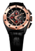 Black inner bezel with minute scale. Black and gold dial. Luminous hour markers. Rose gold skeleton hour hands with luminous coating. Central second hand. Minute markers around the outer rim.  Date window located between the 4 and 5 o'clock positions. Power reserve indicator located at the 3 o'clock position. This watch has three chronograph sub-dials at 6, 9 and 12 o'clock.