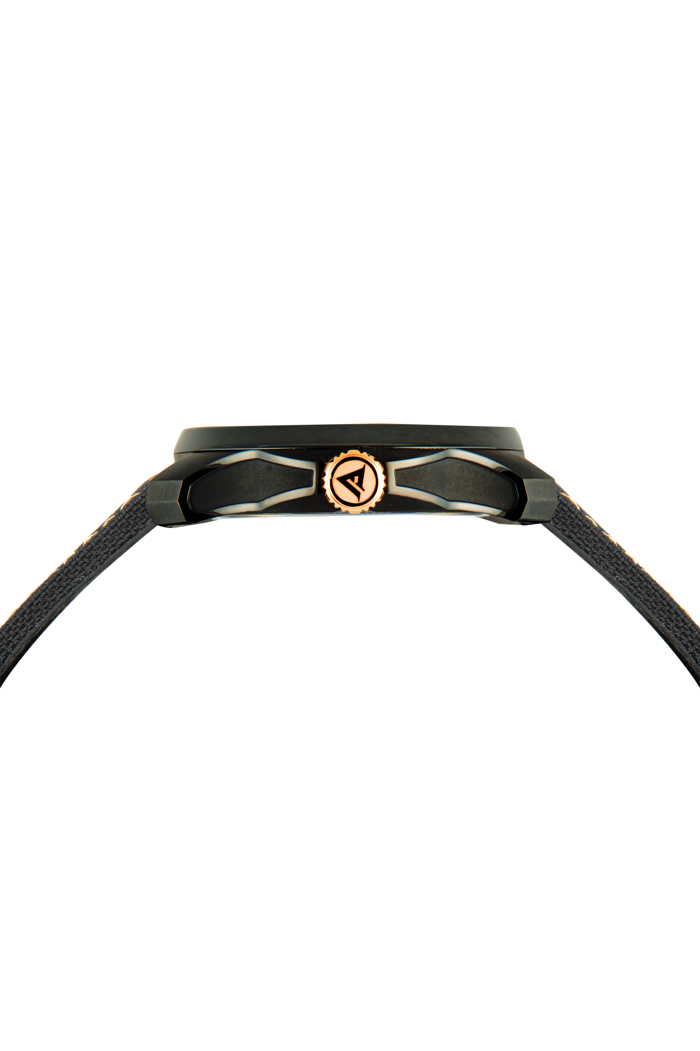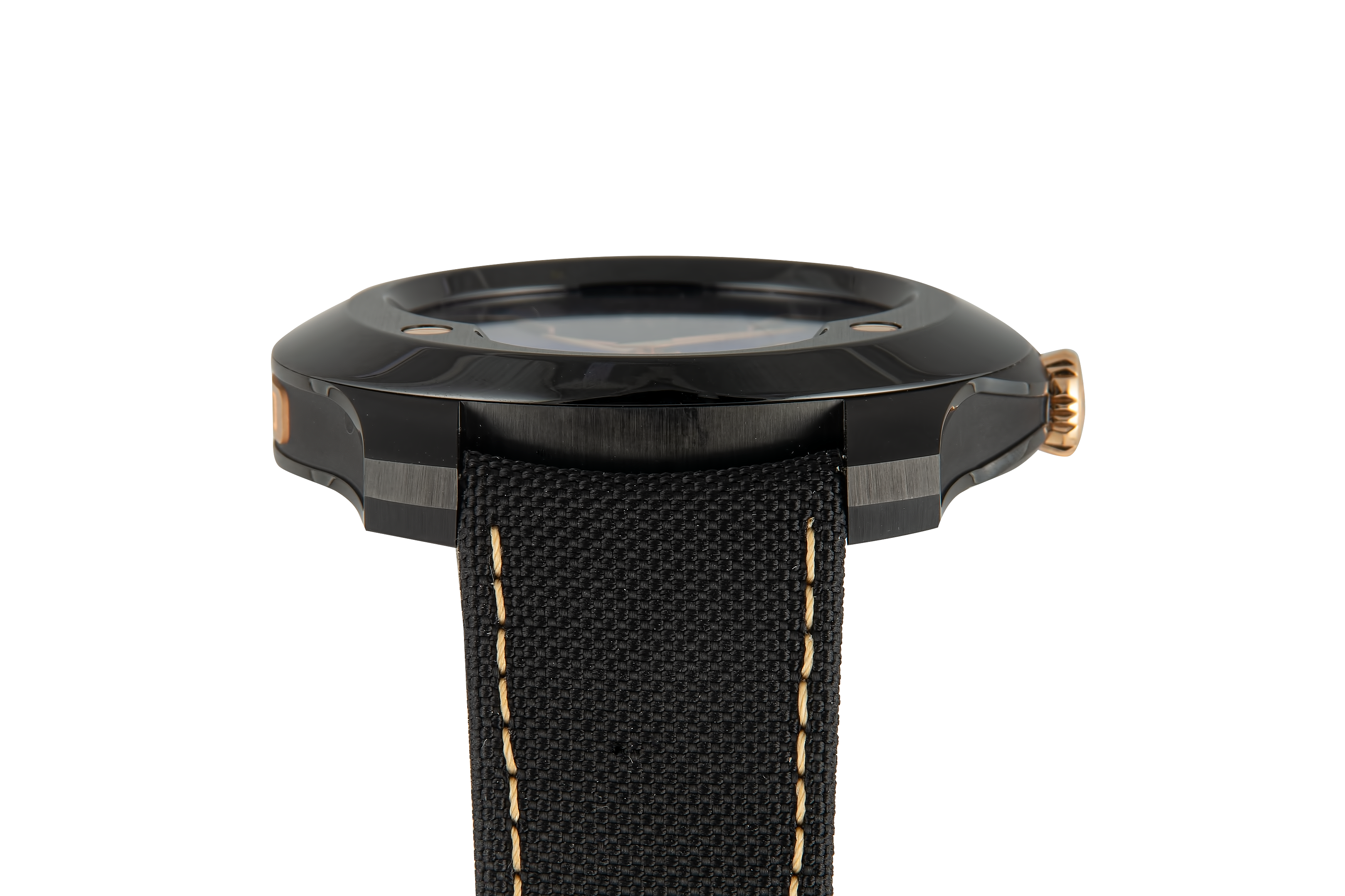 The watch features a commanding 47*40,5 mm case constructed from a high-tech blend of titanium and carbon, accentuated by a meticulously crafted bezel. With a subtle 2.46 grams of gold incorporated into the design, this watch strikes a perfect balance between lightweight strength and luxurious detail. The sapphire crystal with anti-reflective coating offers crystal-clear visibility and protection against scratches.