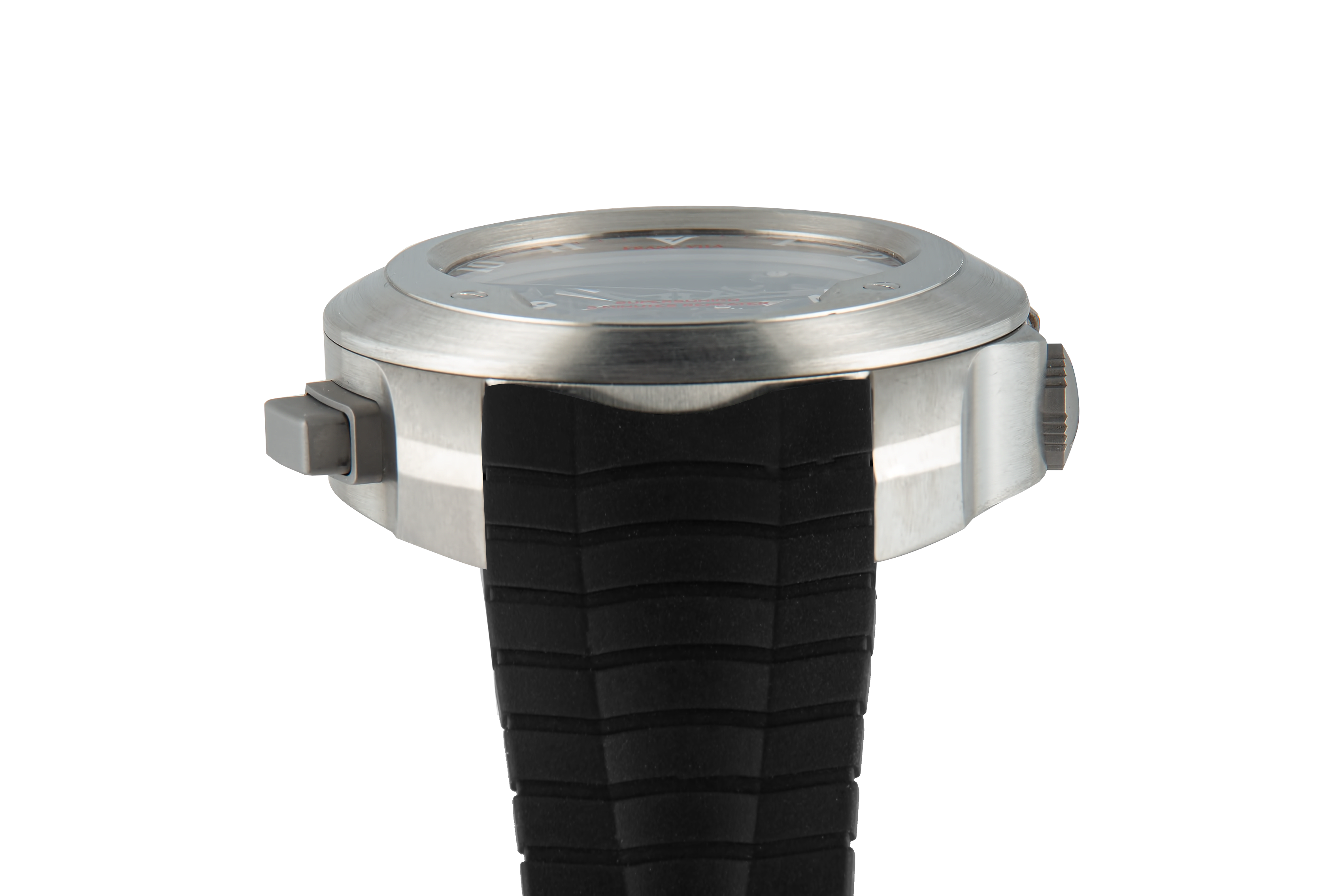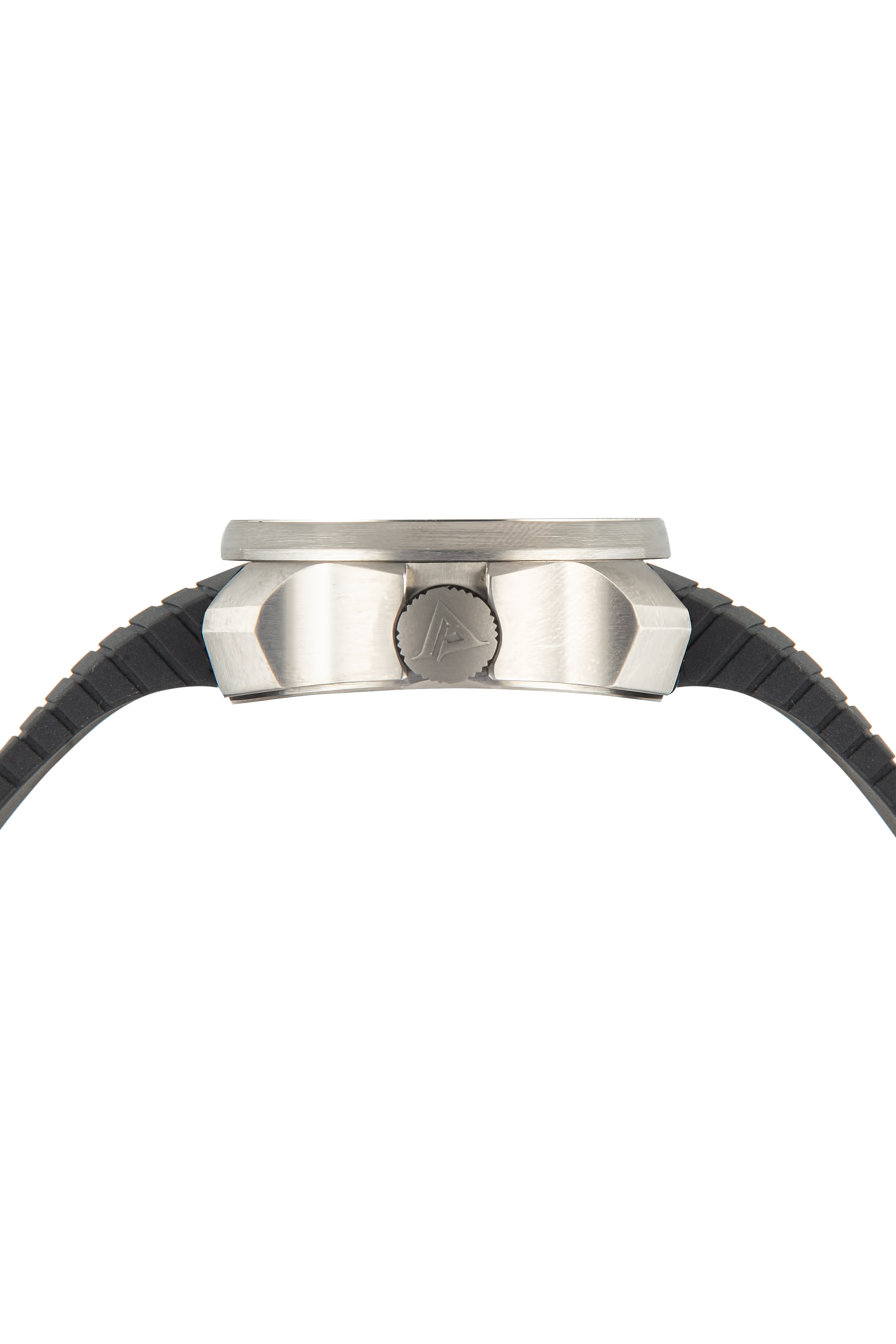 Encased in a robust 50 x 45 mm titanium case, the watch commands presence with its durable yet lightweight construction. The sapphire crystal, enhanced with anti-reflective coating, guarantees exceptional clarity and scratch resistance. Complementing the sporty silhouette, the black rubber strap provides comfort and a sleek, contemporary look.