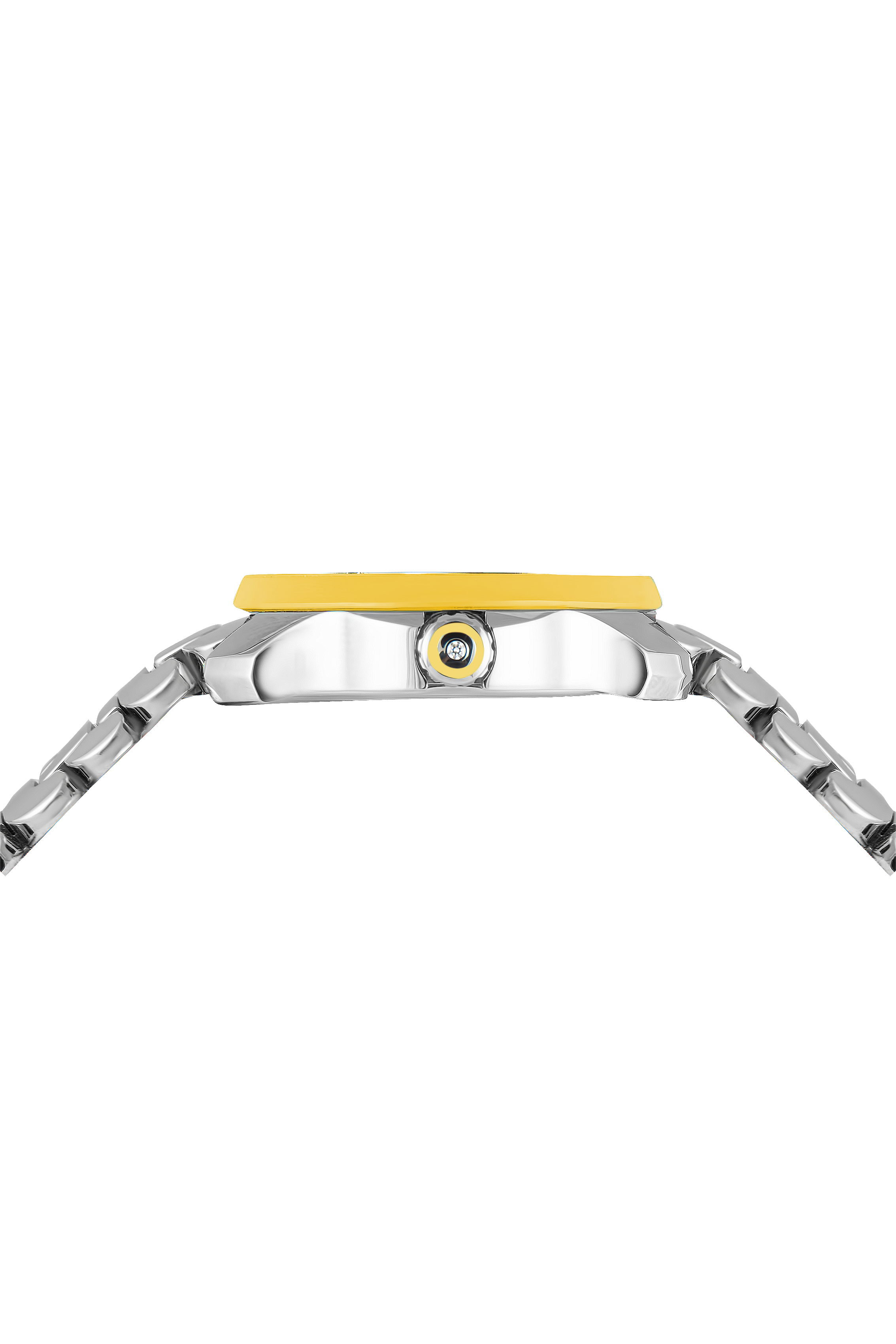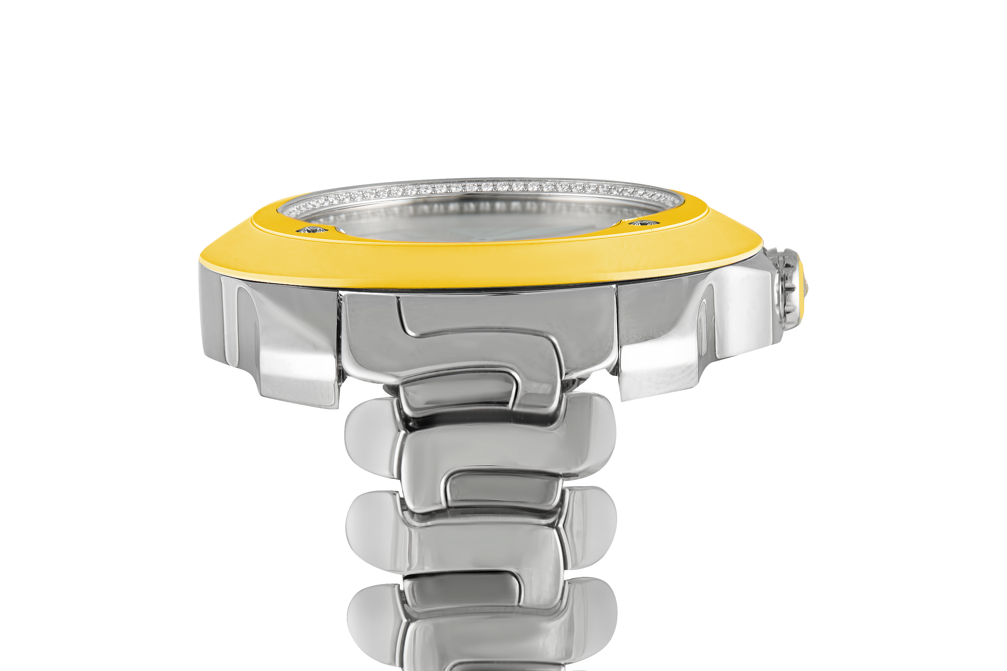 Combining vibrant design with impeccable craftsmanship, the Franc Vila Tribute In Colors Ref. 80Q.SS.NEO.108C offers a distinctive and elegant timepiece for women. Its polished and satin-finished stainless steel case (41 x 37 mm) with a slim 9 mm profile is luxuriously enhanced by dazzling diamond accents and a colorful composite bezel that adds a lively pop of color.