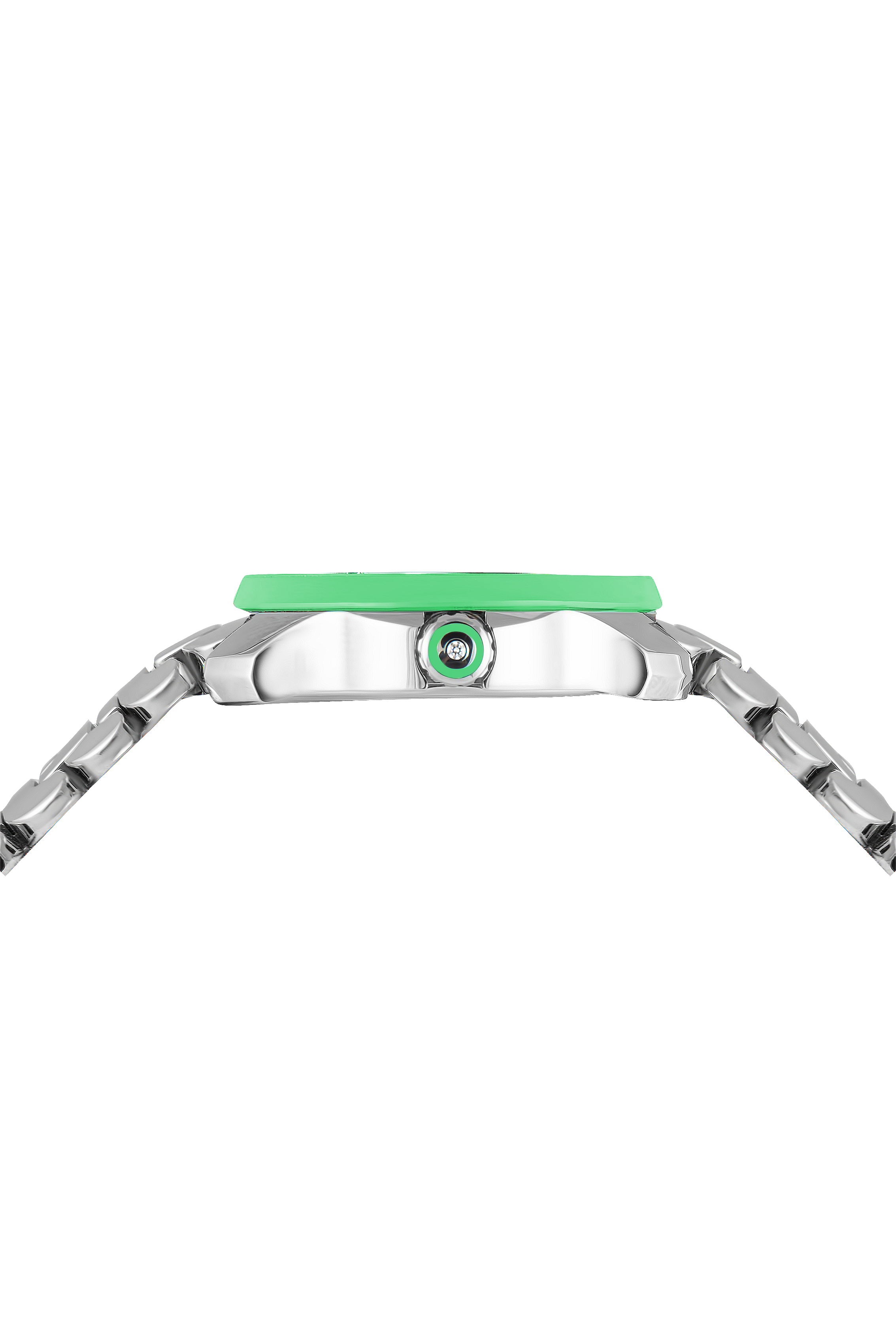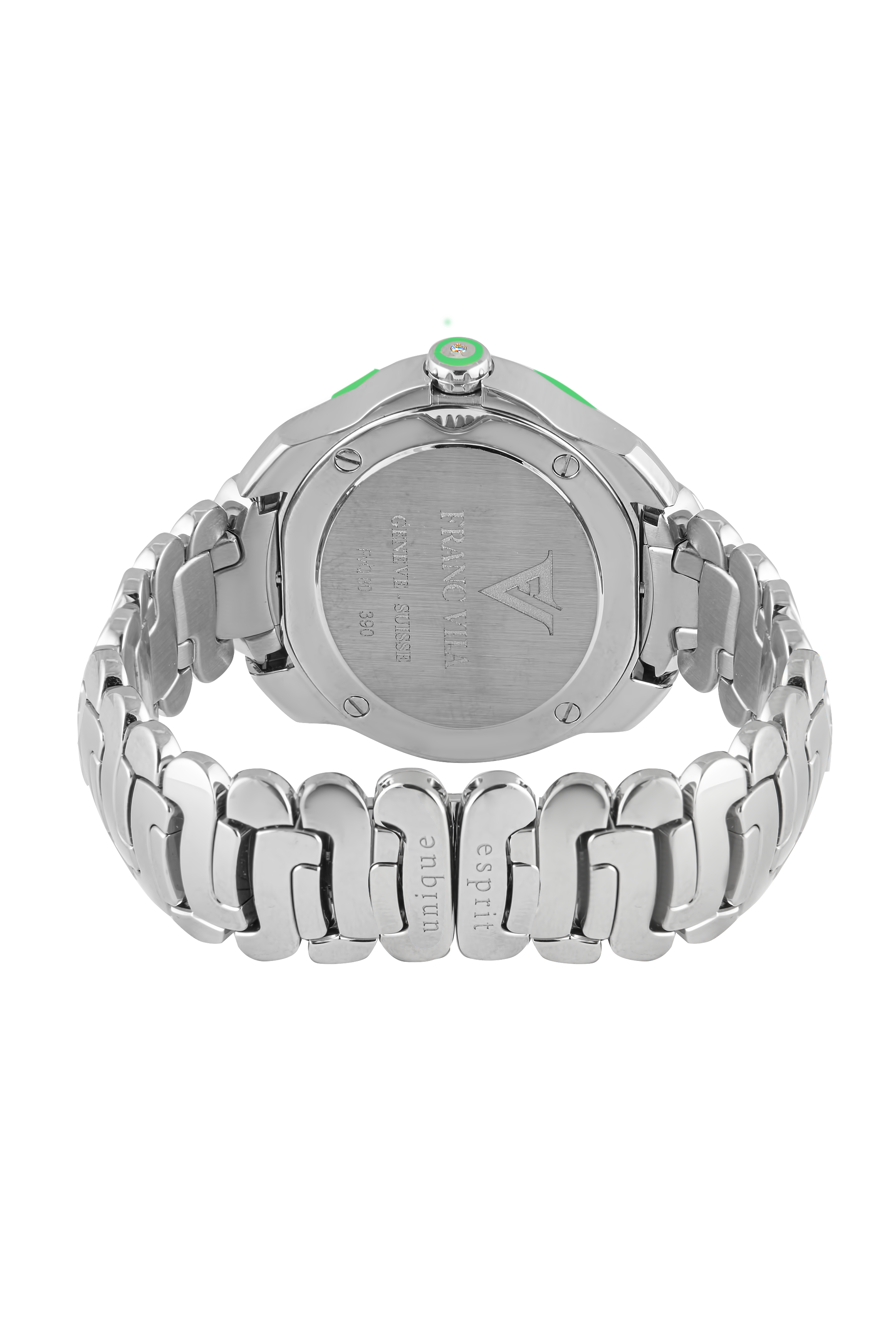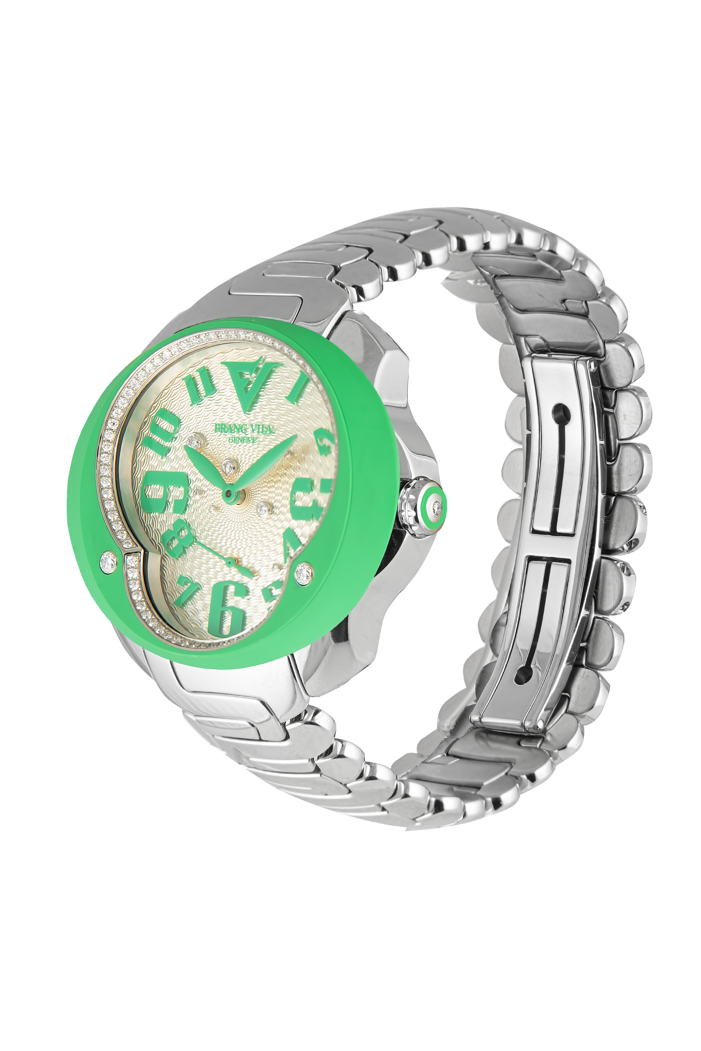 Exuding vibrant elegance and modern craftsmanship, the Franc Vila Tribute In Colors Ref. 80Q.SS.NEO.3405C is a captivating women’s watch designed to stand out. The polished and satin-finished stainless steel case (41 x 37 mm) features a slender 9 mm height, enhanced by sparkling diamond accents and a colorful composite bezel that adds a playful touch.