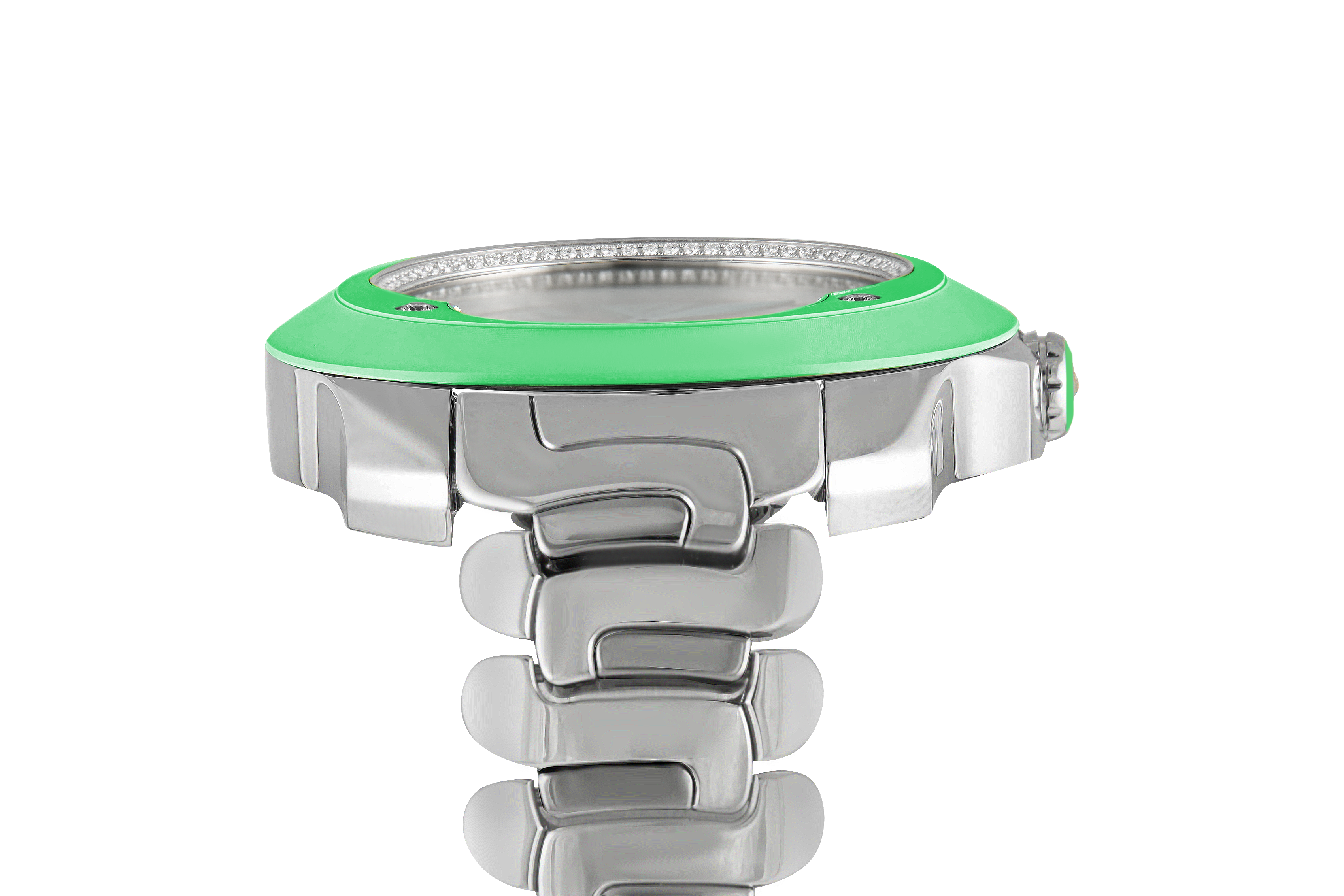 Polished and satin-finished stainless steel case adorned with diamonds