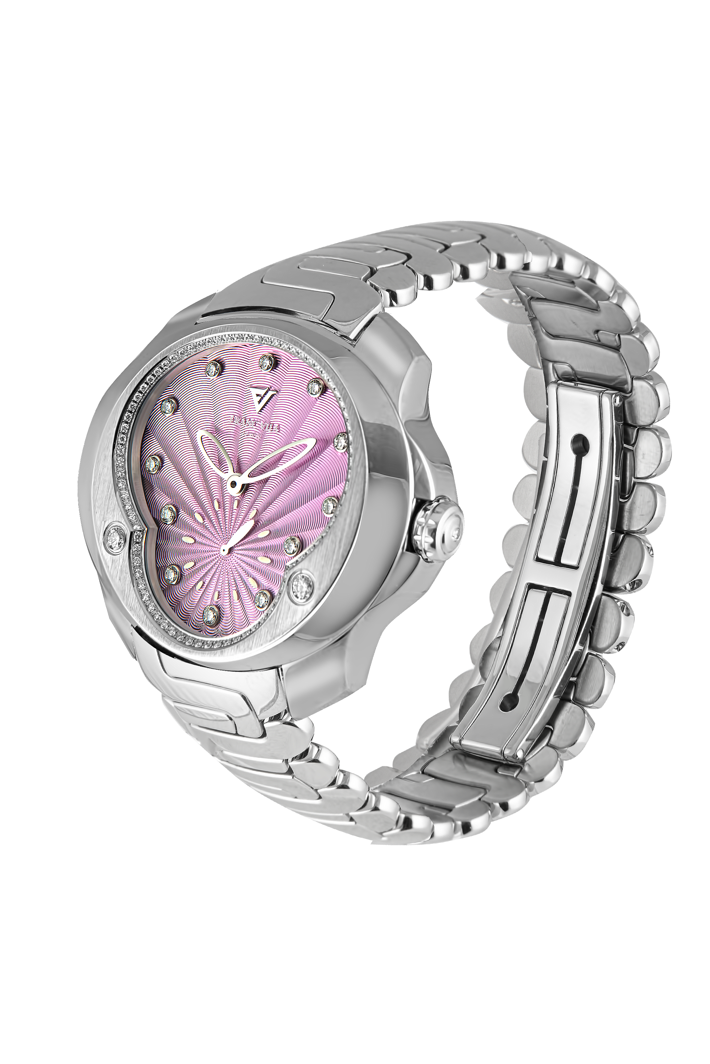 A bold expression of refined femininity, the Franc Vila Tribute To Ladies Ref. 80Q.SS.SL.VIO blends vibrant color with timeless luxury. This limited edition timepiece features a uniquely contoured 38 x 37 mm case (9 mm thick), crafted from polished and satin-finished stainless steel, and set with radiant diamonds—part of the exclusive Tribute To Ladies Light collection.