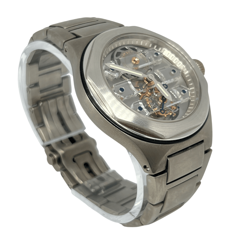 A sapphire crystal protects the front and back side of the watch. Titanium bracelet with foldihg clasp. While the watch’s water-resistance up to 30 m ensures durability.