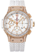 White dial. Red gold skeleton hour hands with luminous coating. Arabic numerals and hour markers with luminous coating. Arabic numerals appear at the 2,4,8,10 and 12 o’clock positions. Minute markers around the outer rim. Central second hand. Date window located between the 4 and 5 o'clock positions. This watch has three chronograph sub-dials at 3 ,6 and 9 o'clock.