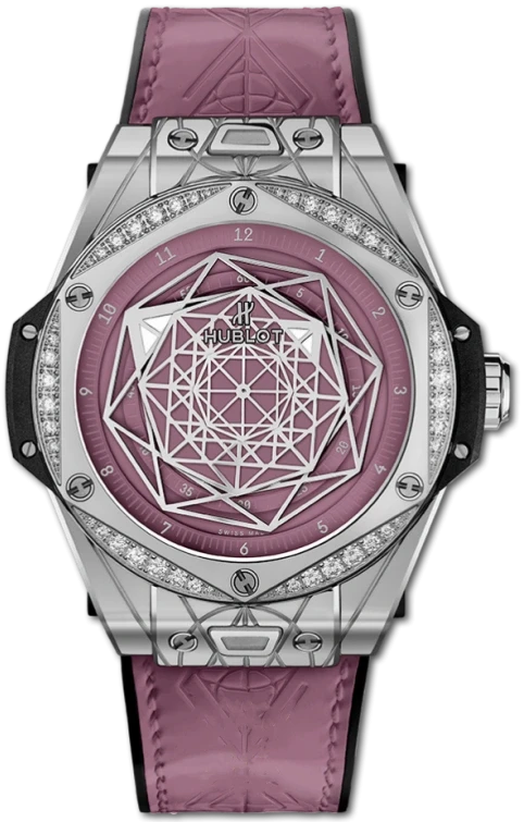 The pink dial, distinctively unconventional, abandons traditional hands in favor of a white luminescent coating that indicates the hours and minutes, surrounded by Arabic numerals along the outer edge. This timepiece focuses on essential functions of hours and minutes, embodying simplicity and elegance. The self-winding mechanical movement is powered by the precise Calibre HUB1710, providing an impressive power reserve of approximately 50 hours. With a case thickness of 12.55mm, the watch strikes a perfect balance between presence and comfort.