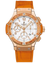 A sapphire crystal protects the front side of the watch. Orange alligator skin on rubber strap with gold clasp, ensuring both comfort and style. While the watch’s water-resistance up to 50 m ensures durability.
