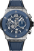 Preowned-441.NL.5171.RX Hublot. The Hublot Big Bang Unico Preowned-441.NL.5171.RX is a men's luxury watch with a silver-tone titanium case and a blue rubber strap. The watch features a fixed blue ceramic bezel and a skeleton dial with index-Arabic numeral hour markers. The watch has analog display and a date display at the 3 o'clock position. This watch has a chronograph function with two sub-dials displaying 60-minute and 60-second measurements. The watch is powered by a Hublot Calibre HUB1280 automatic movement, composed of 354 parts and 43 jewels, which beats at a frequency of 28,800 vibrations per hour and has a power reserve of approximately 72 hours. The watch's sapphire crystal is scratch-resistant, and it has a screw-down crown and transparent see-through case back. The case is round and measures 42mm in diameter. The watch has a tang clasp and is water-resistant up to 100 meters (330 feet). In addition to the chronograph function, this watch also features a column wheel, which is a type of mechanism that helps to control the start, stop, and reset functions of the chronograph. Overall, the Hublot Big Bang Unico Preowned-441.NL.5171.RX is a high-quality luxury watch with a unique design and advanced features, making it a great choice for those who want a premium timepiece with a sporty feel.